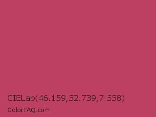 CIELab 46.159,52.739,7.558 Color is a normal rose color and the nearest color is Deep Blush #b44668. Hex code #bd4063 and RGB value is rgb(189,64,99). In RGB color space, this color is composed of 74% red, 25% green, 39% blue, In CMYK color space, this color is composed of 0% cyan, 66% magenta, 48% yellow , 26% black , In HSL color space, this color has a hue angle of 343° , 49% saturation and 50% lightness.