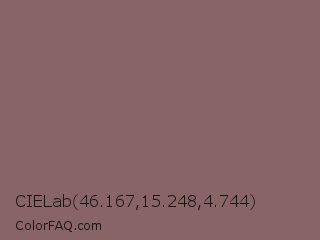 CIELab 46.167,15.248,4.744 Color is a normal red color and the nearest color is Mauve Taupe #915f6d. Hex code #896466 and RGB value is rgb(137,100,102). In RGB color space, this color is composed of 54% red, 39% green, 40% blue, In CMYK color space, this color is composed of 0% cyan, 27% magenta, 26% yellow , 46% black , In HSL color space, this color has a hue angle of 357° , 16% saturation and 46% lightness.