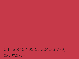 CIELab 46.195,56.304,23.779 Color is a normal red color and the nearest color is Dingy Dungeon #c53151. Hex code #c63949 and RGB value is rgb(198,57,73). In RGB color space, this color is composed of 78% red, 22% green, 29% blue, In CMYK color space, this color is composed of 0% cyan, 71% magenta, 63% yellow , 22% black , In HSL color space, this color has a hue angle of 353° , 55% saturation and 50% lightness.
