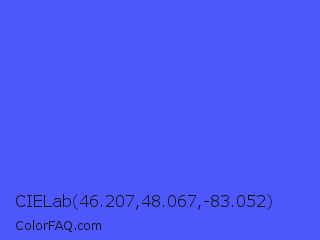 CIELab 46.207,48.067,-83.052 Color is a light blue color and the nearest color is Ultramarine Blue #4166f5. Hex code #4d57fc and RGB value is rgb(77,87,252). In RGB color space, this color is composed of 30% red, 34% green, 99% blue, In CMYK color space, this color is composed of 69% cyan, 65% magenta, 0% yellow , 1% black , In HSL color space, this color has a hue angle of 237° , 97% saturation and 65% lightness.