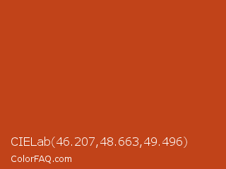 CIELab 46.207,48.663,49.496 Color is a normal color and the nearest color is Tia Maria #c1440e. Hex code #c14319 and RGB value is rgb(193,67,25). In RGB color space, this color is composed of 76% red, 26% green, 10% blue, In CMYK color space, this color is composed of 0% cyan, 65% magenta, 87% yellow , 24% black , In HSL color space, this color has a hue angle of 15° , 77% saturation and 43% lightness.