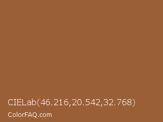 CIELab 46.216,20.542,32.768 Color is a normal orange color and the nearest color is Coconut #965a3e. Hex code #9b5f37 and RGB value is rgb(155,95,55). In RGB color space, this color is composed of 61% red, 37% green, 22% blue, In CMYK color space, this color is composed of 0% cyan, 39% magenta, 65% yellow , 39% black , In HSL color space, this color has a hue angle of 24° , 48% saturation and 41% lightness.