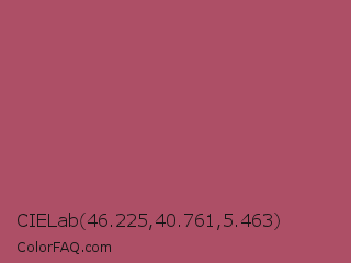 CIELab 46.225,40.761,5.463 Color is a normal red color and the nearest color is Cadillac #b04c6a. Hex code #ad4f66 and RGB value is rgb(173,79,102). In RGB color space, this color is composed of 68% red, 31% green, 40% blue, In CMYK color space, this color is composed of 0% cyan, 54% magenta, 41% yellow , 32% black , In HSL color space, this color has a hue angle of 345° , 37% saturation and 49% lightness.