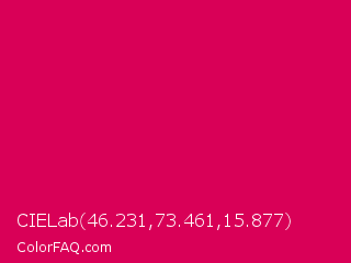 CIELab 46.231,73.461,15.877 Color is a normal rose color and the nearest color is Rubine Red #d10056. Hex code #d90057 and RGB value is rgb(217,0,87). In RGB color space, this color is composed of 85% red, 0% green, 34% blue, In CMYK color space, this color is composed of 0% cyan, 100% magenta, 60% yellow , 15% black , In HSL color space, this color has a hue angle of 336° , 100% saturation and 43% lightness.