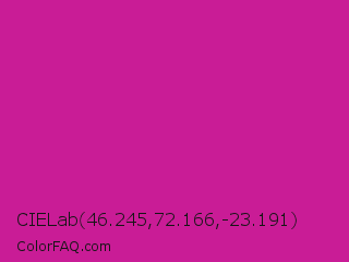 CIELab 46.245,72.166,-23.191 Color is a normal magenta color and the nearest color is Royal Fuchsia #ca2c92. Hex code #c91c96 and RGB value is rgb(201,28,150). In RGB color space, this color is composed of 79% red, 11% green, 59% blue, In CMYK color space, this color is composed of 0% cyan, 86% magenta, 25% yellow , 21% black , In HSL color space, this color has a hue angle of 318° , 76% saturation and 45% lightness.