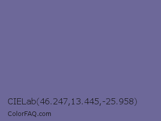 CIELab 46.247,13.445,-25.958 Color is a normal indigo color and the nearest color is Dark Blue Gray #666699. Hex code #6d6899 and RGB value is rgb(109,104,153). In RGB color space, this color is composed of 43% red, 41% green, 60% blue, In CMYK color space, this color is composed of 29% cyan, 32% magenta, 0% yellow , 40% black , In HSL color space, this color has a hue angle of 246° , 19% saturation and 50% lightness.