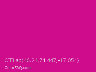 CIELab 46.24,74.447,-17.054 Color is a normal magenta color and the nearest color is Red Violet #c71585. Hex code #cf0d8c and RGB value is rgb(207,13,140). In RGB color space, this color is composed of 81% red, 5% green, 55% blue, In CMYK color space, this color is composed of 0% cyan, 94% magenta, 32% yellow , 19% black , In HSL color space, this color has a hue angle of 321° , 88% saturation and 43% lightness.