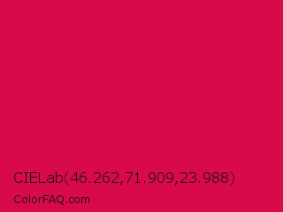 CIELab 46.262,71.909,23.988 Color is a normal rose color and the nearest color is Debian Red #d70a53. Hex code #d90a4a and RGB value is rgb(217,10,74). In RGB color space, this color is composed of 85% red, 4% green, 29% blue, In CMYK color space, this color is composed of 0% cyan, 95% magenta, 66% yellow , 15% black , In HSL color space, this color has a hue angle of 341° , 91% saturation and 45% lightness.