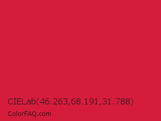 CIELab 46.263,68.191,31.788 Color is a normal red color and the nearest color is Crimson #dc143c. Hex code #d61c3d and RGB value is rgb(214,28,61). In RGB color space, this color is composed of 84% red, 11% green, 24% blue, In CMYK color space, this color is composed of 0% cyan, 87% magenta, 71% yellow , 16% black , In HSL color space, this color has a hue angle of 349° , 77% saturation and 47% lightness.