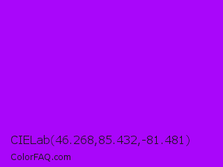 CIELab 46.268,85.432,-81.481 Color is a normal purple color and the nearest color is Vivid Violet #9f00ff. Hex code #a906fa and RGB value is rgb(169,6,250). In RGB color space, this color is composed of 66% red, 2% green, 98% blue, In CMYK color space, this color is composed of 32% cyan, 98% magenta, 0% yellow , 2% black , In HSL color space, this color has a hue angle of 280° , 96% saturation and 50% lightness.