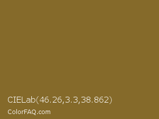CIELab 46.26,3.3,38.862 Color is a normal orange color and the nearest color is Kumera #886221. Hex code #856a2a and RGB value is rgb(133,106,42). In RGB color space, this color is composed of 52% red, 42% green, 16% blue, In CMYK color space, this color is composed of 0% cyan, 20% magenta, 68% yellow , 48% black , In HSL color space, this color has a hue angle of 42° , 52% saturation and 34% lightness.
