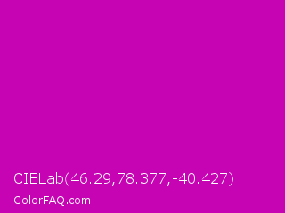 CIELab 46.29,78.377,-40.427 Color is a normal magenta color and the nearest color is Deep Magenta #cc00cc. Hex code #c704b3 and RGB value is rgb(199,4,179). In RGB color space, this color is composed of 78% red, 2% green, 70% blue, In CMYK color space, this color is composed of 0% cyan, 98% magenta, 10% yellow , 22% black , In HSL color space, this color has a hue angle of 306° , 96% saturation and 40% lightness.