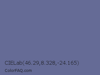 CIELab 46.29,8.328,-24.165 Color is a normal blue color and the nearest color is Dark Blue Gray #666699. Hex code #656b96 and RGB value is rgb(101,107,150). In RGB color space, this color is composed of 40% red, 42% green, 59% blue, In CMYK color space, this color is composed of 33% cyan, 29% magenta, 0% yellow , 41% black , In HSL color space, this color has a hue angle of 233° , 20% saturation and 49% lightness.
