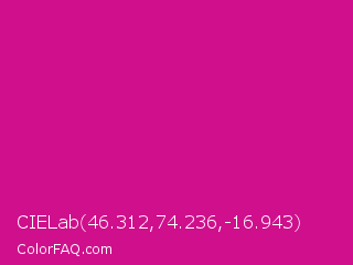 CIELab 46.312,74.236,-16.943 Color is a normal magenta color and the nearest color is Red Violet #c71585. Hex code #cf0f8c and RGB value is rgb(207,15,140). In RGB color space, this color is composed of 81% red, 6% green, 55% blue, In CMYK color space, this color is composed of 0% cyan, 93% magenta, 32% yellow , 19% black , In HSL color space, this color has a hue angle of 321° , 86% saturation and 44% lightness.