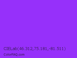 CIELab 46.312,75.181,-81.511 Color is a normal violet color and the nearest color is Veronica #a020f0. Hex code #9630fa and RGB value is rgb(150,48,250). In RGB color space, this color is composed of 59% red, 19% green, 98% blue, In CMYK color space, this color is composed of 40% cyan, 81% magenta, 0% yellow , 2% black , In HSL color space, this color has a hue angle of 270° , 95% saturation and 58% lightness.