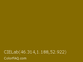 CIELab 46.314,1.188,52.922 Color is a dark yellow color and the nearest color is Corn Harvest #8b6b0b. Hex code #856b00 and RGB value is rgb(133,107,0). In RGB color space, this color is composed of 52% red, 42% green, 0% blue, In CMYK color space, this color is composed of 0% cyan, 20% magenta, 100% yellow , 48% black , In HSL color space, this color has a hue angle of 48° , 100% saturation and 26% lightness.
