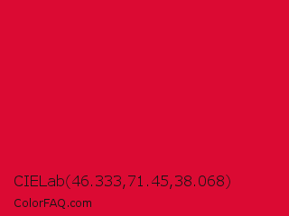 CIELab 46.333,71.45,38.068 Color is a normal red color and the nearest color is Medium Candy Apple Red #e2062c. Hex code #db0a33 and RGB value is rgb(219,10,51). In RGB color space, this color is composed of 86% red, 4% green, 20% blue, In CMYK color space, this color is composed of 0% cyan, 95% magenta, 77% yellow , 14% black , In HSL color space, this color has a hue angle of 348° , 91% saturation and 45% lightness.