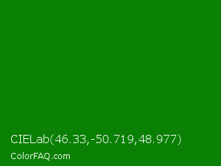 CIELab 46.33,-50.719,48.977 Color is a dark green color and the nearest color is Office Green #008000. Hex code #0a8005 and RGB value is rgb(10,128,5). In RGB color space, this color is composed of 4% red, 50% green, 2% blue, In CMYK color space, this color is composed of 92% cyan, 0% magenta, 96% yellow , 50% black , In HSL color space, this color has a hue angle of 118° , 92% saturation and 26% lightness.