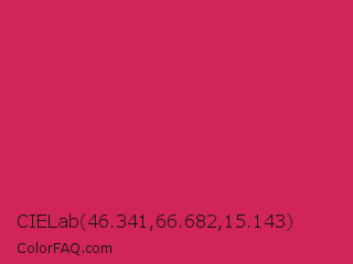 CIELab 46.341,66.682,15.143 Color is a normal rose color and the nearest color is Rose Red #c21e56. Hex code #d12458 and RGB value is rgb(209,36,88). In RGB color space, this color is composed of 82% red, 14% green, 35% blue, In CMYK color space, this color is composed of 0% cyan, 83% magenta, 58% yellow , 18% black , In HSL color space, this color has a hue angle of 342° , 71% saturation and 48% lightness.