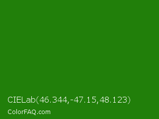 CIELab 46.344,-47.15,48.123 Color is a dark green color and the nearest color is Napier Green #2a8000. Hex code #217f0a and RGB value is rgb(33,127,10). In RGB color space, this color is composed of 13% red, 50% green, 4% blue, In CMYK color space, this color is composed of 74% cyan, 0% magenta, 92% yellow , 50% black , In HSL color space, this color has a hue angle of 108° , 85% saturation and 27% lightness.
