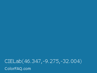 CIELab 46.347,-9.275,-32.004 Color is a normal blue color and the nearest color is Matisse #1b659d. Hex code #1575a3 and RGB value is rgb(21,117,163). In RGB color space, this color is composed of 8% red, 46% green, 64% blue, In CMYK color space, this color is composed of 87% cyan, 28% magenta, 0% yellow , 36% black , In HSL color space, this color has a hue angle of 199° , 77% saturation and 36% lightness.
