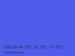 CIELab 46.355,39.235,-73.281 Color is a light blue color and the nearest color is Ultramarine Blue #4166f5. Hex code #505deb and RGB value is rgb(80,93,235). In RGB color space, this color is composed of 31% red, 36% green, 92% blue, In CMYK color space, this color is composed of 66% cyan, 60% magenta, 0% yellow , 8% black , In HSL color space, this color has a hue angle of 235° , 79% saturation and 62% lightness.