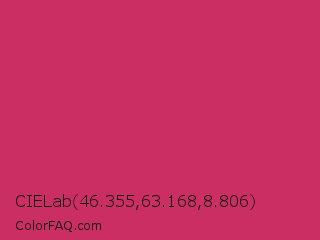 CIELab 46.355,63.168,8.806 Color is a normal rose color and the nearest color is Dingy Dungeon #c53151. Hex code #cb2e62 and RGB value is rgb(203,46,98). In RGB color space, this color is composed of 80% red, 18% green, 38% blue, In CMYK color space, this color is composed of 0% cyan, 77% magenta, 52% yellow , 20% black , In HSL color space, this color has a hue angle of 340° , 63% saturation and 49% lightness.