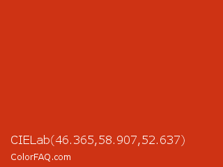 CIELab 46.365,58.907,52.637 Color is a normal red color and the nearest color is Vermilion #d9381e. Hex code #ce3314 and RGB value is rgb(206,51,20). In RGB color space, this color is composed of 81% red, 20% green, 8% blue, In CMYK color space, this color is composed of 0% cyan, 75% magenta, 90% yellow , 19% black , In HSL color space, this color has a hue angle of 10° , 82% saturation and 44% lightness.