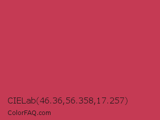 CIELab 46.36,56.358,17.257 Color is a normal red color and the nearest color is Brick Red #cb4154. Hex code #c53a54 and RGB value is rgb(197,58,84). In RGB color space, this color is composed of 77% red, 23% green, 33% blue, In CMYK color space, this color is composed of 0% cyan, 71% magenta, 57% yellow , 23% black , In HSL color space, this color has a hue angle of 349° , 55% saturation and 50% lightness.