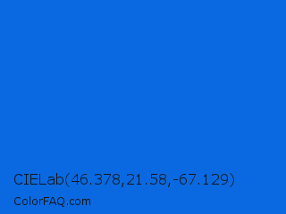 CIELab 46.378,21.58,-67.129 Color is a normal blue color and the nearest color is True Blue #0073cf. Hex code #0a69e0 and RGB value is rgb(10,105,224). In RGB color space, this color is composed of 4% red, 41% green, 88% blue, In CMYK color space, this color is composed of 96% cyan, 53% magenta, 0% yellow , 12% black , In HSL color space, this color has a hue angle of 213° , 91% saturation and 46% lightness.