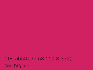 CIELab 46.37,68.119,8.372 Color is a normal rose color and the nearest color is Dogwood Rose #d71868. Hex code #d12163 and RGB value is rgb(209,33,99). In RGB color space, this color is composed of 82% red, 13% green, 39% blue, In CMYK color space, this color is composed of 0% cyan, 84% magenta, 53% yellow , 18% black , In HSL color space, this color has a hue angle of 338° , 73% saturation and 47% lightness.