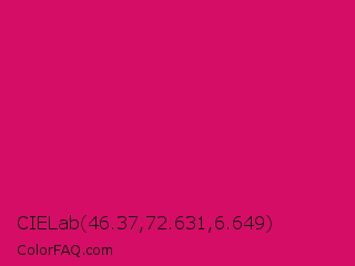 CIELab 46.37,72.631,6.649 Color is a normal rose color and the nearest color is Dogwood Rose #d71868. Hex code #d60d66 and RGB value is rgb(214,13,102). In RGB color space, this color is composed of 84% red, 5% green, 40% blue, In CMYK color space, this color is composed of 0% cyan, 94% magenta, 52% yellow , 16% black , In HSL color space, this color has a hue angle of 333° , 89% saturation and 45% lightness.