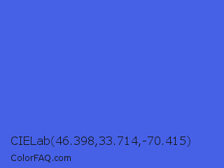 CIELab 46.398,33.714,-70.415 Color is a normal blue color and the nearest color is Royal Blue #4169e1. Hex code #4661e6 and RGB value is rgb(70,97,230). In RGB color space, this color is composed of 27% red, 38% green, 90% blue, In CMYK color space, this color is composed of 70% cyan, 58% magenta, 0% yellow , 10% black , In HSL color space, this color has a hue angle of 230° , 76% saturation and 59% lightness.