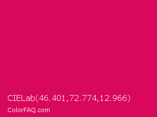 CIELab 46.401,72.774,12.966 Color is a normal rose color and the nearest color is Debian Red #d70a53. Hex code #d8095c and RGB value is rgb(216,9,92). In RGB color space, this color is composed of 85% red, 4% green, 36% blue, In CMYK color space, this color is composed of 0% cyan, 96% magenta, 57% yellow , 15% black , In HSL color space, this color has a hue angle of 336° , 92% saturation and 44% lightness.