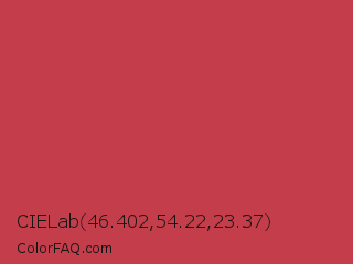 CIELab 46.402,54.22,23.37 Color is a normal red color and the nearest color is English Vermillion #cc474b. Hex code #c43d4a and RGB value is rgb(196,61,74). In RGB color space, this color is composed of 77% red, 24% green, 29% blue, In CMYK color space, this color is composed of 0% cyan, 69% magenta, 62% yellow , 23% black , In HSL color space, this color has a hue angle of 354° , 53% saturation and 50% lightness.
