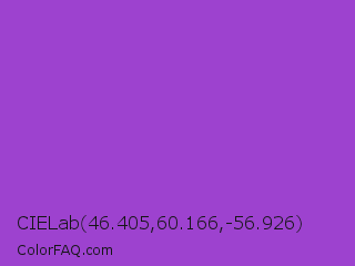 CIELab 46.405,60.166,-56.926 Color is a normal purple color and the nearest color is Dark Orchid #9932cc. Hex code #9d42cf and RGB value is rgb(157,66,207). In RGB color space, this color is composed of 62% red, 26% green, 81% blue, In CMYK color space, this color is composed of 24% cyan, 68% magenta, 0% yellow , 19% black , In HSL color space, this color has a hue angle of 279° , 59% saturation and 54% lightness.