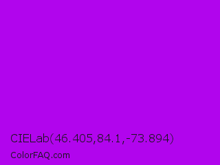 CIELab 46.405,84.1,-73.894 Color is a normal purple color and the nearest color is Vivid Mulberry #b80ce3. Hex code #b105ed and RGB value is rgb(177,5,237). In RGB color space, this color is composed of 69% red, 2% green, 93% blue, In CMYK color space, this color is composed of 25% cyan, 98% magenta, 0% yellow , 7% black , In HSL color space, this color has a hue angle of 284° , 96% saturation and 47% lightness.
