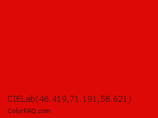CIELab 46.419,71.191,58.621 Color is a normal red color and the nearest color is Rosso Corsa #d40000. Hex code #dd0906 and RGB value is rgb(221,9,6). In RGB color space, this color is composed of 87% red, 4% green, 2% blue, In CMYK color space, this color is composed of 0% cyan, 96% magenta, 97% yellow , 13% black , In HSL color space, this color has a hue angle of 1° , 95% saturation and 45% lightness.