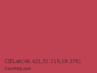 CIELab 46.421,51.119,18.376 Color is a normal red color and the nearest color is Brick Red #cb4154. Hex code #bf4252 and RGB value is rgb(191,66,82). In RGB color space, this color is composed of 75% red, 26% green, 32% blue, In CMYK color space, this color is composed of 0% cyan, 65% magenta, 57% yellow , 25% black , In HSL color space, this color has a hue angle of 352° , 49% saturation and 50% lightness.