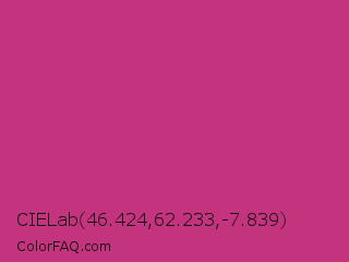 CIELab 46.424,62.233,-7.839 Color is a normal rose color and the nearest color is Fuchsia Purple #cc397b. Hex code #c4337d and RGB value is rgb(196,51,125). In RGB color space, this color is composed of 77% red, 20% green, 49% blue, In CMYK color space, this color is composed of 0% cyan, 74% magenta, 36% yellow , 23% black , In HSL color space, this color has a hue angle of 329° , 59% saturation and 48% lightness.
