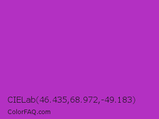 CIELab 46.435,68.972,-49.183 Color is a normal magenta color and the nearest color is Steel Pink #cc33cc. Hex code #b330c2 and RGB value is rgb(179,48,194). In RGB color space, this color is composed of 70% red, 19% green, 76% blue, In CMYK color space, this color is composed of 8% cyan, 75% magenta, 0% yellow , 24% black , In HSL color space, this color has a hue angle of 294° , 60% saturation and 47% lightness.