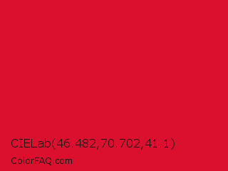 CIELab 46.482,70.702,41.1 Color is a normal red color and the nearest color is Medium Candy Apple Red #e2062c. Hex code #db102e and RGB value is rgb(219,16,46). In RGB color space, this color is composed of 86% red, 6% green, 18% blue, In CMYK color space, this color is composed of 0% cyan, 93% magenta, 79% yellow , 14% black , In HSL color space, this color has a hue angle of 351° , 86% saturation and 46% lightness.