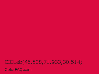 CIELab 46.508,71.933,30.514 Color is a normal rose color and the nearest color is Rich Carmine #d70040. Hex code #db0a40 and RGB value is rgb(219,10,64). In RGB color space, this color is composed of 86% red, 4% green, 25% blue, In CMYK color space, this color is composed of 0% cyan, 95% magenta, 71% yellow , 14% black , In HSL color space, this color has a hue angle of 344° , 91% saturation and 45% lightness.