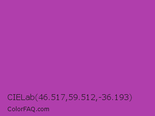 CIELab 46.517,59.512,-36.193 Color is a normal magenta color and the nearest color is Byzantine #bd33a4. Hex code #b03eac and RGB value is rgb(176,62,172). In RGB color space, this color is composed of 69% red, 24% green, 67% blue, In CMYK color space, this color is composed of 0% cyan, 65% magenta, 2% yellow , 31% black , In HSL color space, this color has a hue angle of 302° , 48% saturation and 47% lightness.