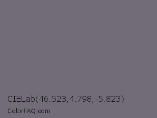 CIELab 46.523,4.798,-5.823 Color is a normal violet color and the nearest color is Fedora #796a78. Hex code #726c78 and RGB value is rgb(114,108,120). In RGB color space, this color is composed of 45% red, 42% green, 47% blue, In CMYK color space, this color is composed of 5% cyan, 10% magenta, 0% yellow , 53% black , In HSL color space, this color has a hue angle of 270° , 5% saturation and 45% lightness.