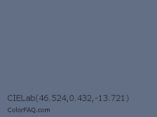 CIELab 46.524,0.432,-13.721 Color is a normal blue color and the nearest color is Pale Sky #6e7783. Hex code #626f85 and RGB value is rgb(98,111,133). In RGB color space, this color is composed of 38% red, 44% green, 52% blue, In CMYK color space, this color is composed of 26% cyan, 17% magenta, 0% yellow , 48% black , In HSL color space, this color has a hue angle of 218° , 15% saturation and 45% lightness.