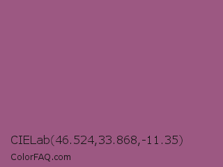 CIELab 46.524,33.868,-11.35 Color is a normal magenta color and the nearest color is Antique Fuchsia #915c83. Hex code #9c5882 and RGB value is rgb(156,88,130). In RGB color space, this color is composed of 61% red, 35% green, 51% blue, In CMYK color space, this color is composed of 0% cyan, 44% magenta, 17% yellow , 39% black , In HSL color space, this color has a hue angle of 323° , 28% saturation and 48% lightness.