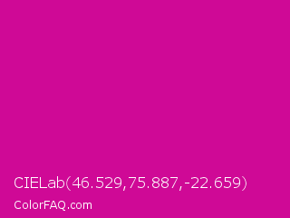 CIELab 46.529,75.887,-22.659 Color is a normal magenta color and the nearest color is Red Violet #c71585. Hex code #cf0996 and RGB value is rgb(207,9,150). In RGB color space, this color is composed of 81% red, 4% green, 59% blue, In CMYK color space, this color is composed of 0% cyan, 96% magenta, 28% yellow , 19% black , In HSL color space, this color has a hue angle of 317° , 92% saturation and 42% lightness.