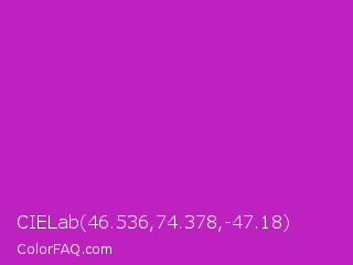 CIELab 46.536,74.378,-47.18 Color is a normal magenta color and the nearest color is Steel Pink #cc33cc. Hex code #bd21bf and RGB value is rgb(189,33,191). In RGB color space, this color is composed of 74% red, 13% green, 75% blue, In CMYK color space, this color is composed of 1% cyan, 83% magenta, 0% yellow , 25% black , In HSL color space, this color has a hue angle of 299° , 71% saturation and 44% lightness.