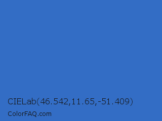 CIELab 46.542,11.65,-51.409 Color is a normal blue color and the nearest color is Mariner #286acd. Hex code #336dc5 and RGB value is rgb(51,109,197). In RGB color space, this color is composed of 20% red, 43% green, 77% blue, In CMYK color space, this color is composed of 74% cyan, 45% magenta, 0% yellow , 23% black , In HSL color space, this color has a hue angle of 216° , 59% saturation and 49% lightness.